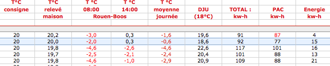 Par exemple, pour une journée en ce moment où il fait assez froid, quelle est ta consommation ( en kw ) par jour pour avoir la température de consigne demandée ?
