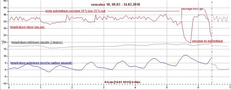 Ma regulation AQUASET ne modifie pas la température de nuit en mode automatique (consigne jour 19° nuit 15°).J'ai installé un systeme de mesure de temperature (ext,int,retour PAC) pour verifier les consignes de temperature de retour d'eau.La seule maniere de reduire la temperature interieure la nuit est de passer en mode hors gel (consigne 12°).